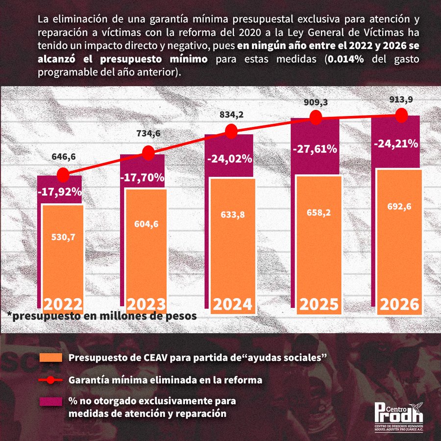 La eliminación de esta garantía ha tenido un impacto directo y negativo en la capacidad del Estado para atender a las víctimas. No asegurar el 0.014% del gasto programable ha significado que, entre 2022 y 2026, el presupuesto de la CEAV ha estado en promedio un 29% por debajo del nivel de financiamiento anteriormente garantizado.