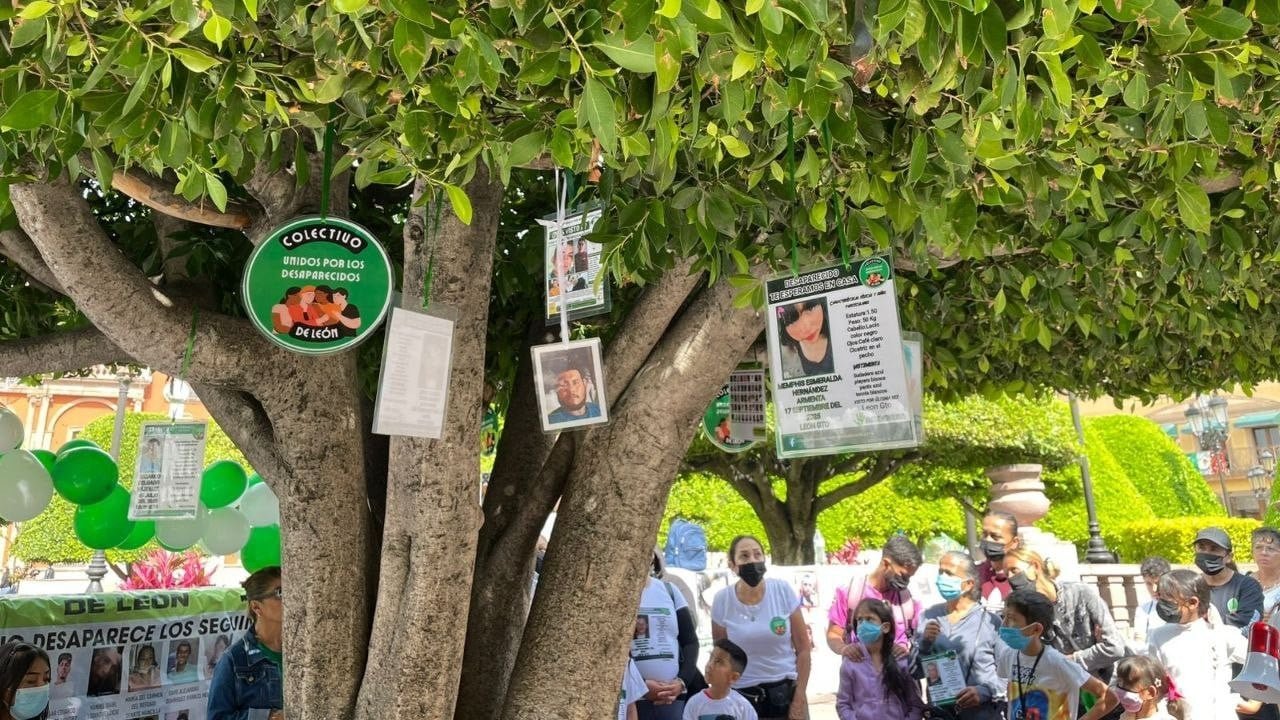 El Colectivo Unidos por los Desaparecidos de León instaló el 28 de septiembre de este año el “Árbol de la Esperanza” con carteles de búsqueda en el municipio de León, en la entidad.  p