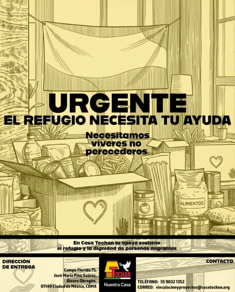 El albergue, Casa Tochan solicitó apoyo para recibir donaciones de víveres no perecederos. En Casa Tochan, se acompaña a personas migrantes y refugiadas con apoyo integral, ofreciéndoles un espacio seguro que les garantice acceso a atención médica. Gracias al compromiso de voluntarios, se trabaja para generar un impacto positivo y duradero. Para recibir las donaciones […]