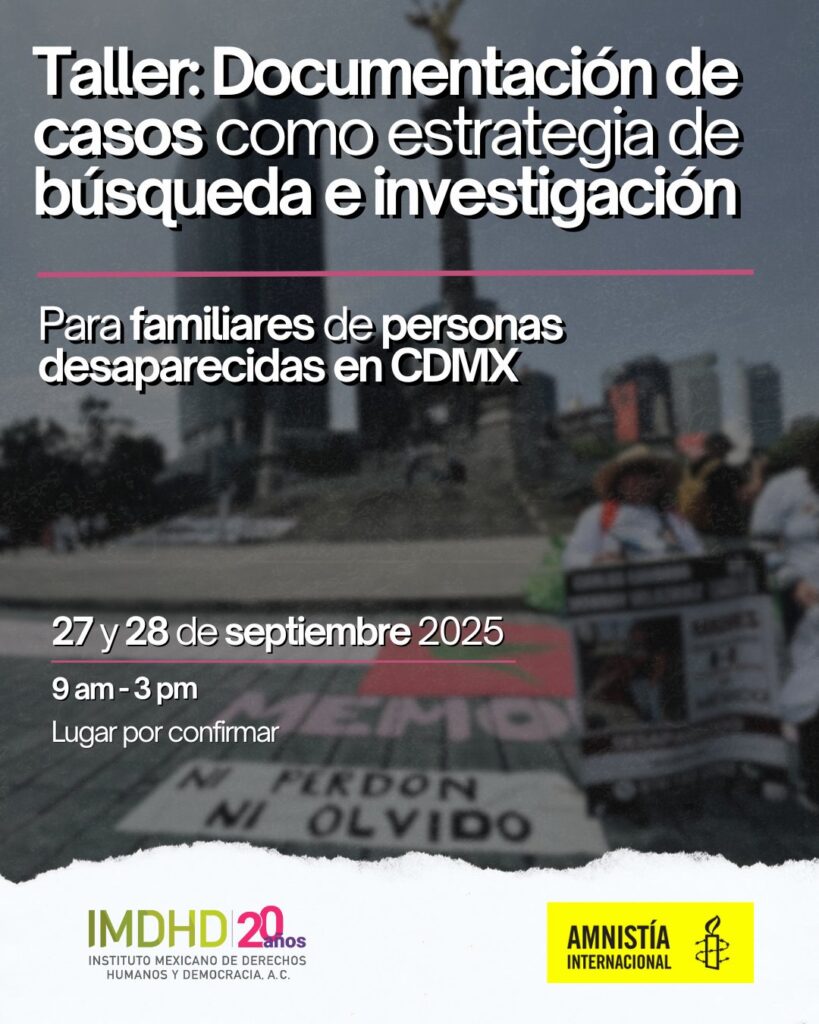 El Instituto Mexicano de Derechos Humanos y Democracia (IMDHD) te invita al taller: Documentación de casos como estrategia de búsqueda e investigación. Está dirigido a familiares de personas desaparecidas en la Ciudad de México. Será este 27 y 28 de septiembre de 9:00 a 15:00 horas. Si bien, el lugar está por confirmarse, puedes registrarte […]