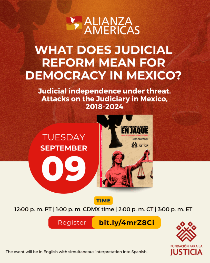 La Alianza Américas y la Fundación para la Justicia (FJEDD) invitan a un conversatorio virtual para presentar los hallazgos del informe Independencia Judicial en Jaque: Ataques al Poder Judicial en México, 2018-2024. Durante el periodo presidencial 2018-2024, el poder judicial se enfrentó a una narrativa populista en su contra y a reformas que culminaron en […]