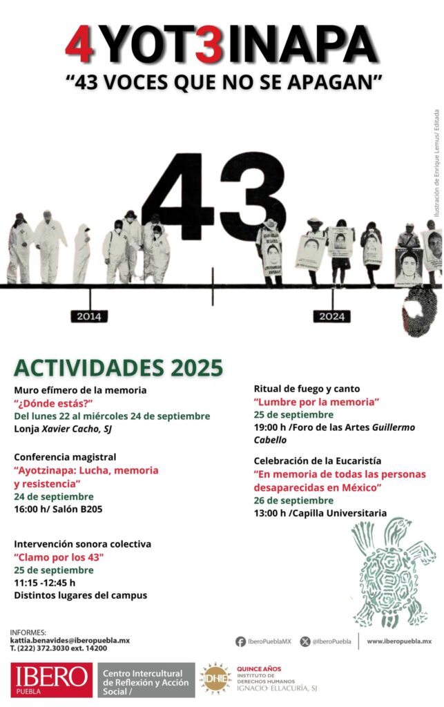 En el marco del memorial de 11 años de la desaparición de los 43 estudiantes de la Normal rural de Ayotzinapa, el Instituto de Derechos Humanos “Ignacio Ellacuría, SJ” de la Universidad Iberoamericana, campus Puebla invita a la jornada #43VocesQueNoSeApagan. Será del 22 al 26 septiembre, en distintos horarios. Habrá conferencias, mural, intervenciones sonoras y […]