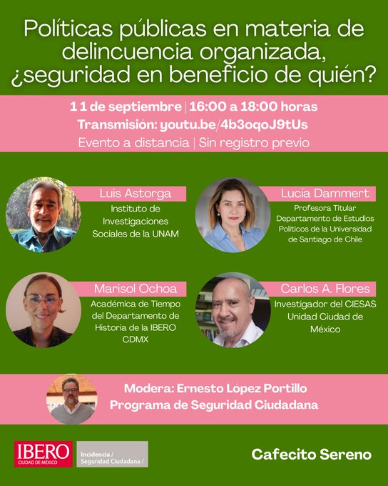 El Programa de Seguridad Ciudadana IBERO (PSC Ibero) invita a la conversación virtual sobre Políticas públicas en materia de delincuencia organizada, ¿seguridad en beneficio de quién? Esto como parte del espacio denominado “Cafecito Sereno“. Participará Luis Astorga, Lucía Dammert, Carlos Flores y Marisol Ochoa, cuatro de las voces más reconocidas en el estudio de la […]