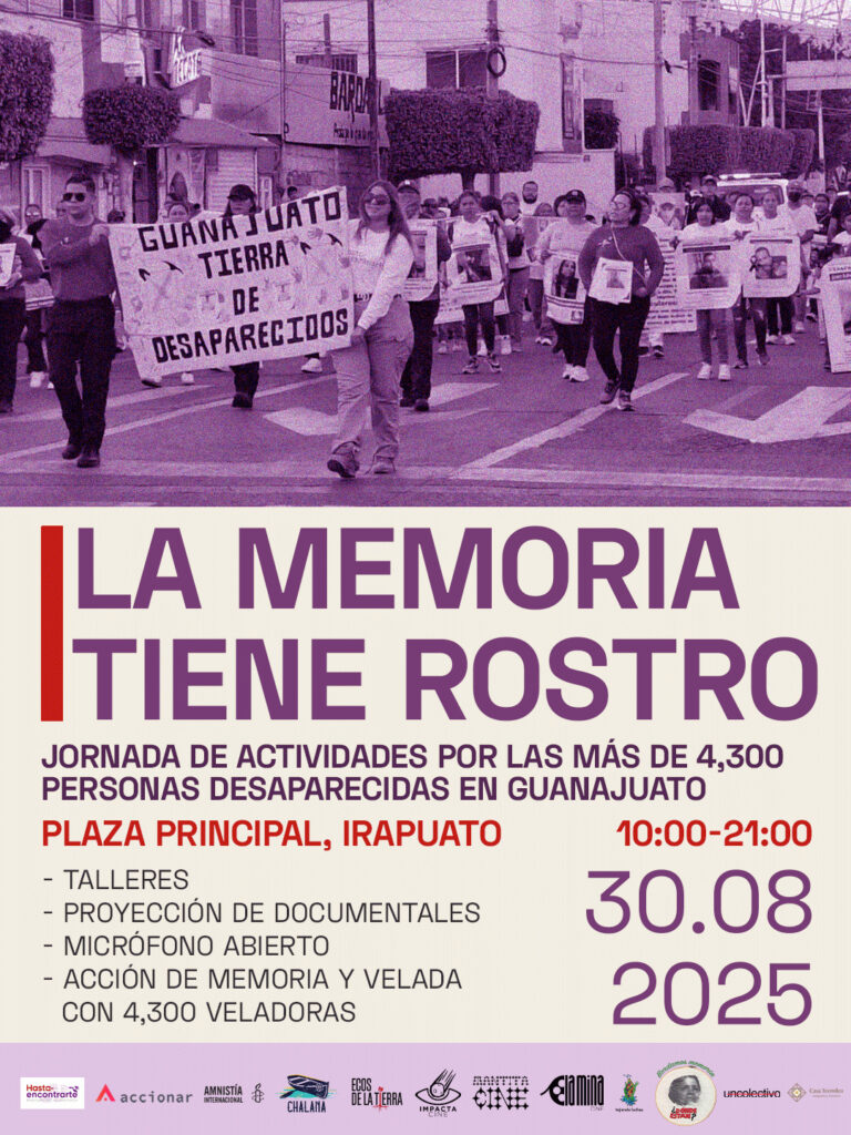 Amnistía Internacional México invita a la jornada de actividades en Guanajuato “La memoria tiene rostro“. Esto ya que en el estado hay más de 4,300 personas siguen desaparecidas. La Jornada será este 30 de agosto en Irapuato, con actividades para honrarles y exigir verdad y justicia: Será en la Plaza Principal, de 10:00 a 21:00 […]