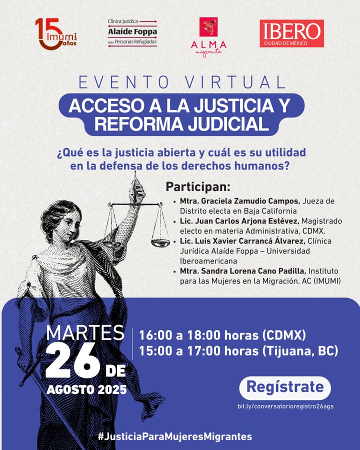 Con el objetivo de hablar sobre la justicia abierta y su utilidad en la defensa de los derechos humanos, el Instituto para las Mujeres en la Migración, AC (IMUMI) convoca al Conservatorio: “Acceso a la Justicia y Reforma Judicial”. Participan: Graciela Zamudio Campos, Jueza de Distrito electa en Baja California; Juan Carlos Arjona Estévez, Magistrado […]