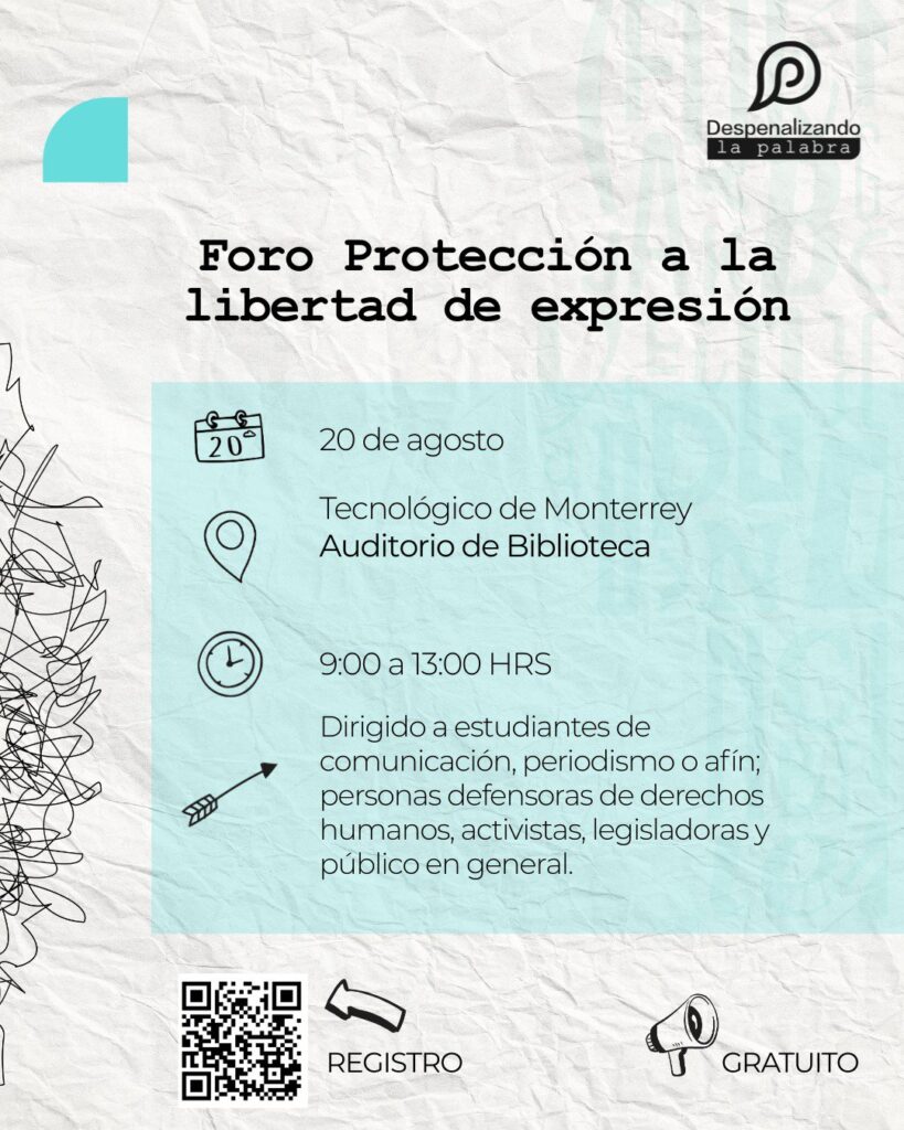 ARTICLE 19 México y Centroamérica invita al foro: “Protección a la libertad de expresión en Nuevo León”. El evento es organizado por el Colectivo Despenalizando La Palabra, una alianza apartidista e integrada por más de 20 organizaciones, periodistas y activistas defensores de derechos humanos. Esta red impulsa iniciativas legislativas en el Congreso del Estado de […]