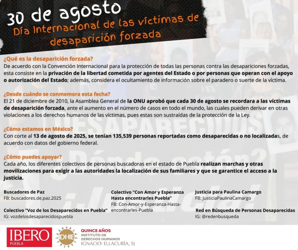 Este 30 de agosto, Día Internacional de las Víctimas de Desaparición Forzada, distintos estados de la República llevarán a cabo numerosas actividades para exigir verdad, búsqueda y justicia frente a la crisis de más de 130 mil personas desaparecidas en el país. Nos unimos al llamado de las familias que siguen buscando a sus seres […]