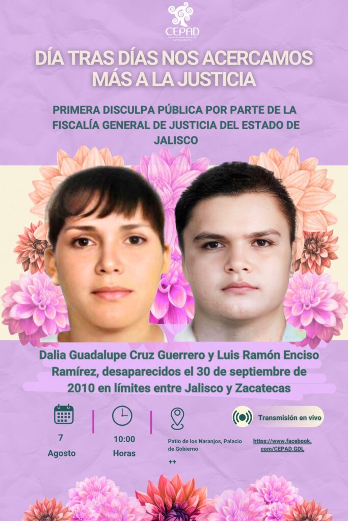 El Centro de Justicia para la Paz y el Desarrollo, A.C. (CEPAD) informó que la Fiscalía del Estado de Jalisco ofrecerá su primera disculpa pública por omisiones y malas prácticas en el acceso a la verdad y justicia en el caso de desaparición de Dalia Guadalupe Cruz Guerrero, Luis Ramón Enciso Ramírez, Bernardo y Carolina; […]