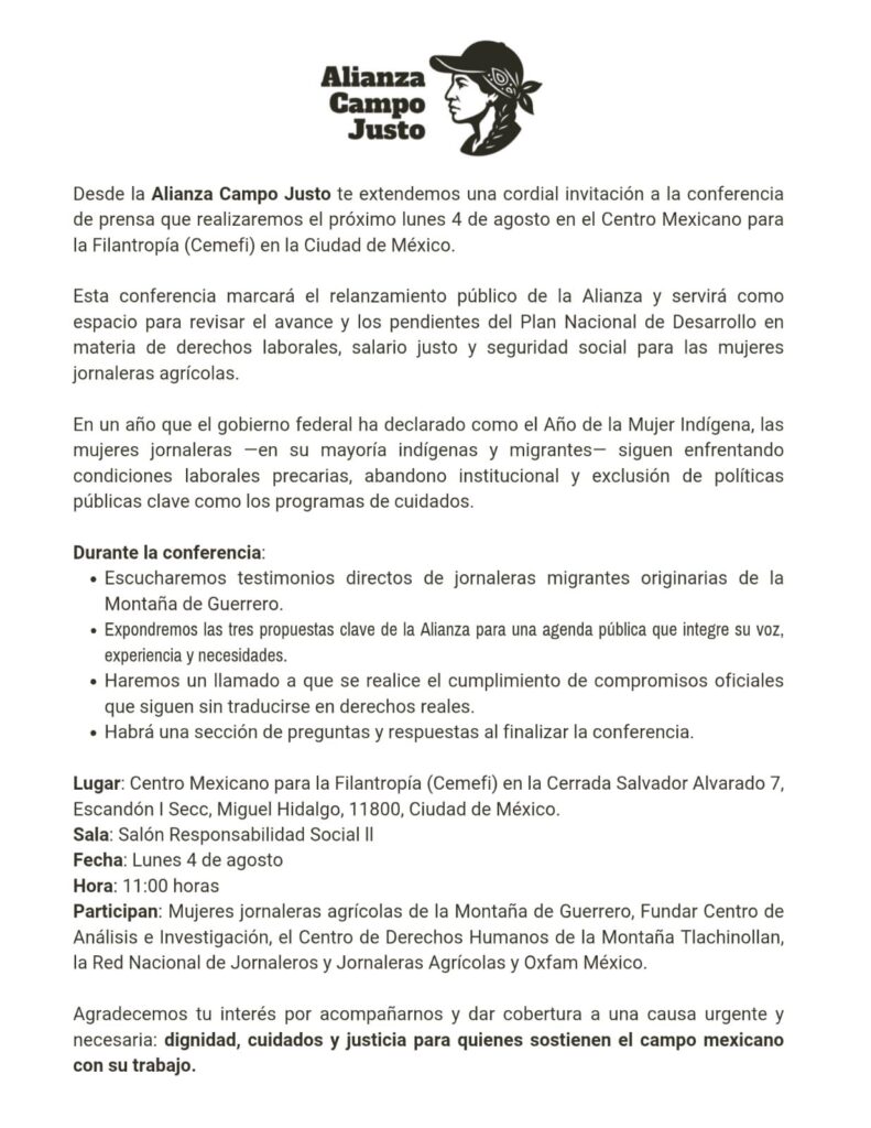 La Alianza Campo Justo invita a la conferencia de prensa de relanzamiento y para abordar tema sobre el Plan Nacional de Desarrollo, en cuanto a derechos laborales, salario justo y seguridad social para mujeres jornaleras agrícolas. En el evento habrá testimonios de mujeres jornaleras de la Montaña de Guerrero, se generarán propuestas de agenda pública […]