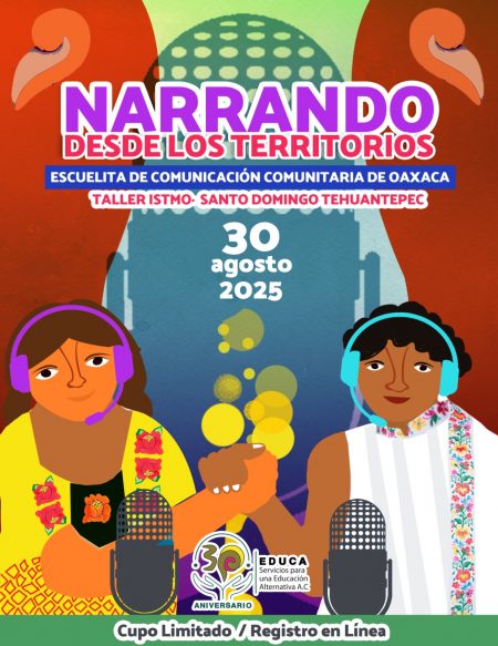 EDUCA invita a comunicadores comunitarios que radican y trabajan en el Istmo de Tehuantepec, Oaxaca, al taller: “Narrando desde los territorios”. Se realizará el sábado 30 de agosto en Santo Domingo Tehuantepec. Es un espacio de diálogo, formación e intercambio de saberes para la construcción de nuevas narrativas a partir de experiencias locales de comunicación […]