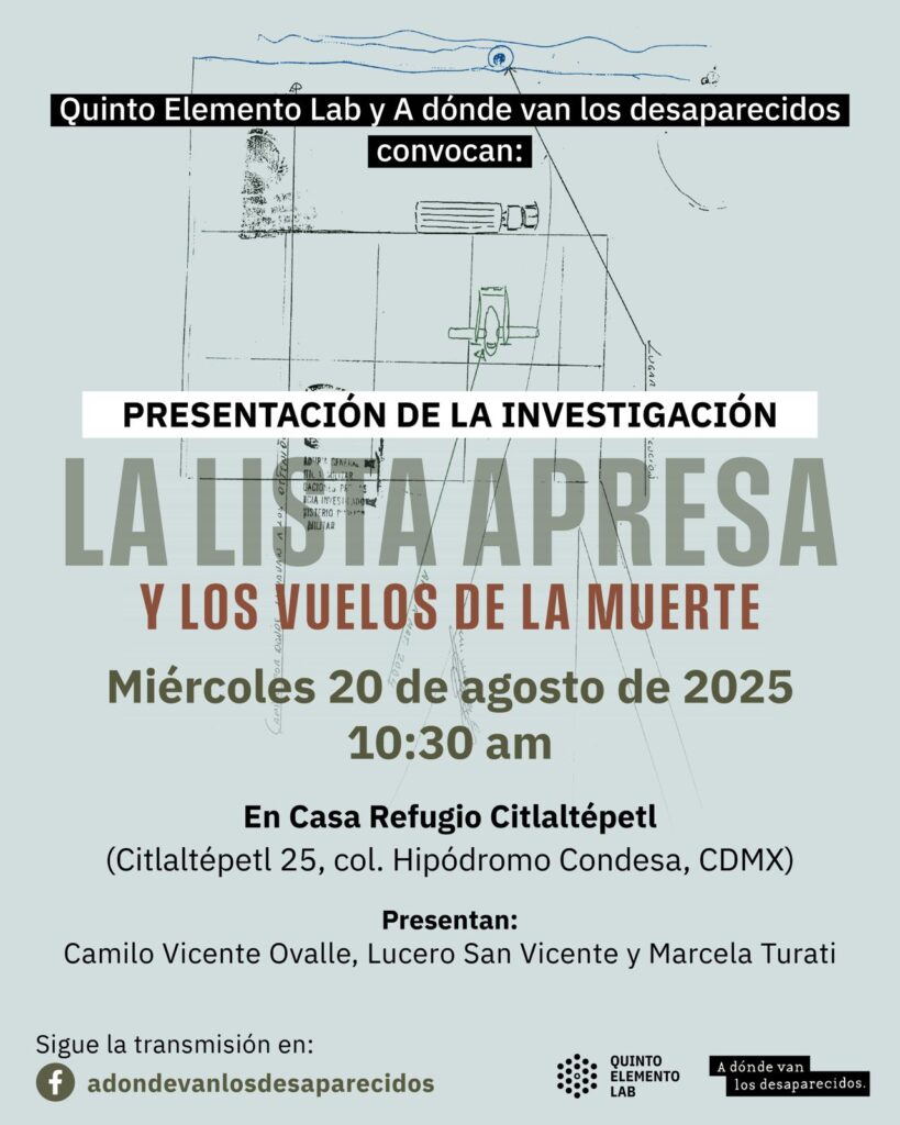 El equipo multidisciplinario que analizó la “Lista Apresa” presentará su investigación este miércoles 20 de agosto. La lista contiene 183 nombres de personas detenidas-desaparecidas entre 1972 y 1974, y posibles víctimas de los Vuelos De La Muerte (VDLM) en México. Por medio de los VDLM, integrantes del Ejército Mexicano trasladaban a la Base Aérea Militar […]