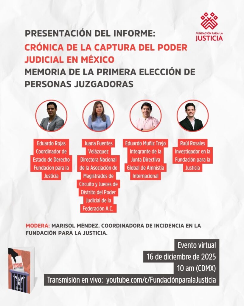 La Fundación para la Justicia invita a la presentación del informe “Crónica de la captura del Poder Judicial. Memoria de la primera elección de personas juzgadoras. En este espacio se analizará la elección de personas juzgadoras que se llevó a cabo en México, la cual es inédita, porque en ningún país se había realizado una […]