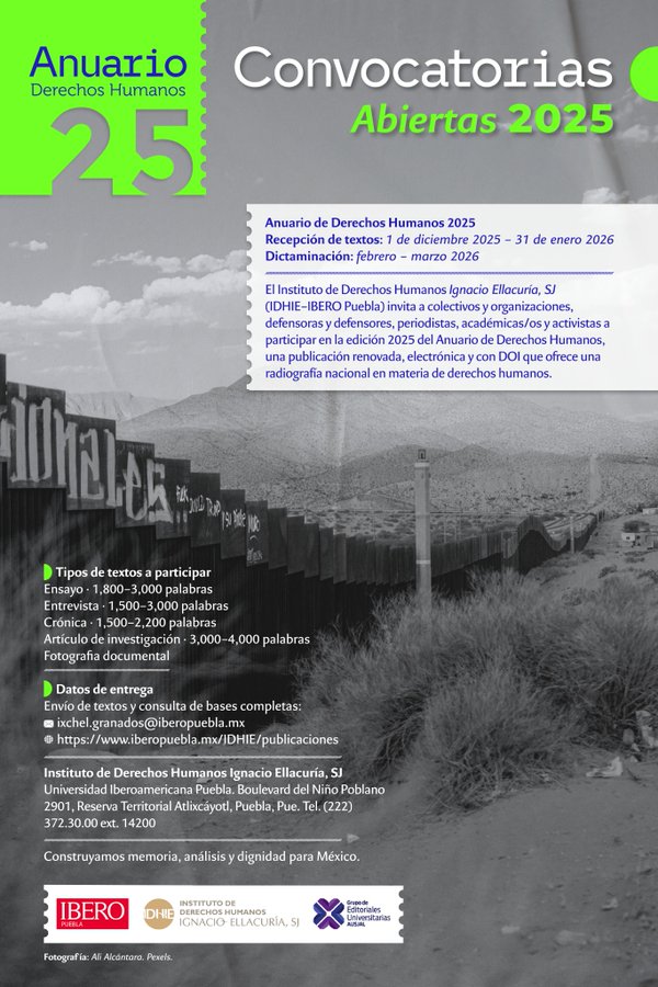 El Instituto de Derechos Humanos “Ignacio Ellacuría, SJ” de la Universidad Iberoamericana, Campus Puebla, emitió la Convocatoria abierta para participar en el Anuario de Derechos Humanos 2025. Se recibirán ensayos, artículos, crónicas, entrevistas, testimonios y fotografía. La fecha de recepción fue desde el 1 diciembre de este año y continuará hasta el 31 ene 2026. […]