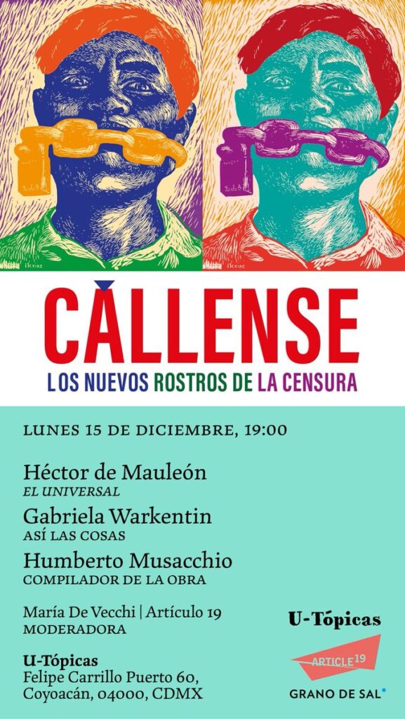 Para hablar sobre la censura en México, Article 19 México y Centroamérica, Librería y Editorial U-Tópicas y Editorial Grano de Sal invitan a la presentación del libro “Cállense: los nuevos rostros de la censura”. De las muchas formas de limitar la libertad de expresión, la censura ejercida desde el poder político es una de las […]
