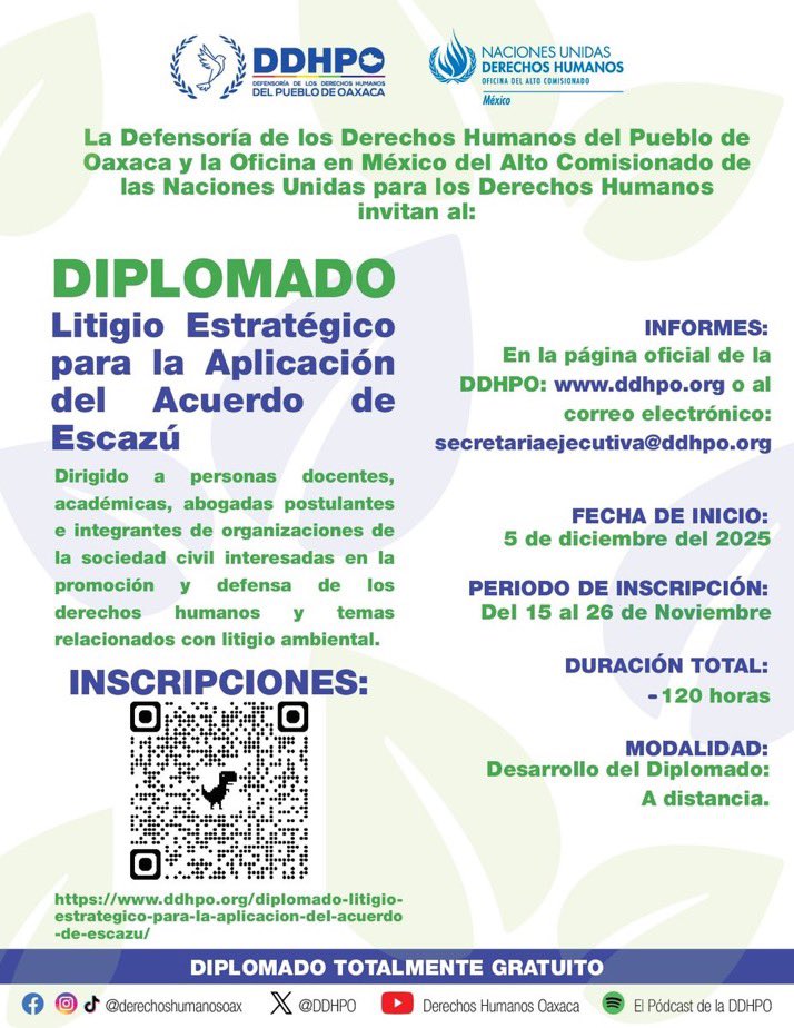 La Defensoría de los Derechos Humanos del Pueblo de Oaxaca (DDHPO) y la Oficina del Alto Comisionado de Naciones Unidas para los Derechos Humanos invitan al Diplomado “Litigio Estratégico para la Aplicación del Acuerdo de Escazú”. Está dirigido a personas docentes, académicas, abogadas postulantes e integrantes de OSC interesadas en la defensa de los derechos […]