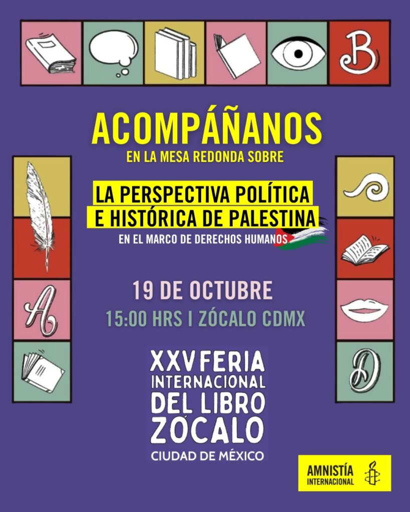 Amnistía Internacional México invita a la mesa redonda “La perspectiva política e histórica de Palestina en el marco de los derechos humanos”, en el marco de la XXV Feria Internacional del Libro del Zócalo. Participará la Embajadora de Palestina en México, Nadya Layla. Será el 19 de octubre a las 15:00 horas en el Zócalo […]