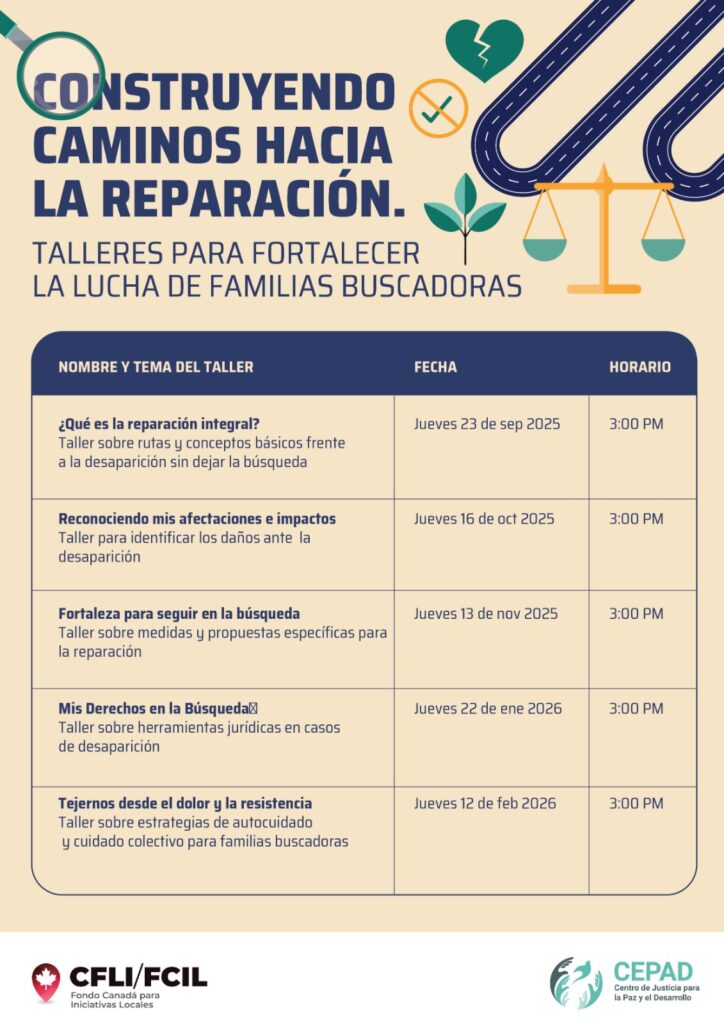 El Centro para la Participación y el Desarrollo Humano Sostenible (CEPAD) pone a disposición sus talleres para todas las familias buscadoras. Informó, para quienes se registraron al taller “Reconociendo mis afectaciones e impactos”, que el cupo ya está completo. Sin embargo, en sus redes sociales publicaron que abrirán nuevos registros para los talleres sobre reparación […]