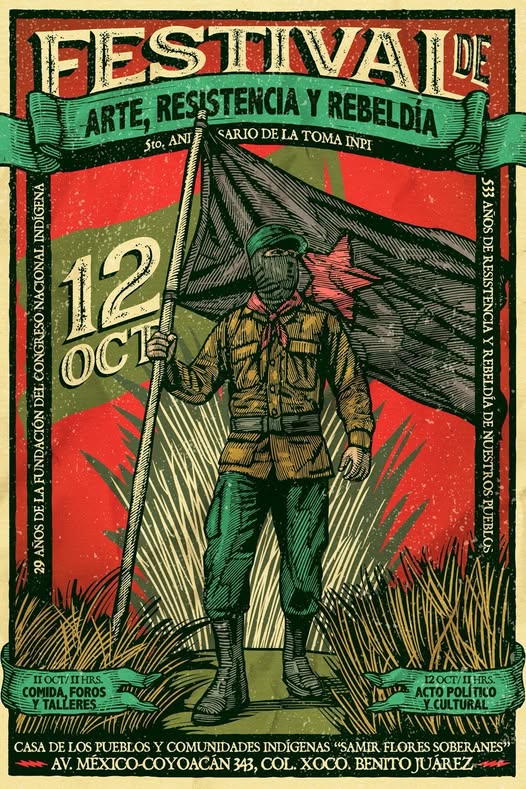 La Comunidad Indígena Otomí residente en la Ciudad de México, el Congreso Nacional Indígena y múltiples colectivos invitan al “Festival de Arte, Resistencia y Rebeldía”, en el marco del quinto aniversario de la toma Instituto Nacional Indígena. Se realizará el 11 y 12 de Octubre, 11:00 horas en Casa de los Pueblos y Comunidades Indígenas […]