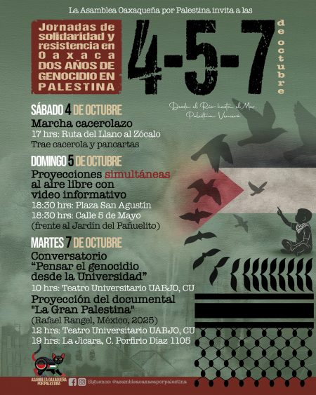 La Asamblea Oaxaqueña por Palestina invita a una serie de actividades en solidaridad con Palestina, a dos años de haberse iniciado el genocidio en Gaza. Estas se realizarán los días 4, 5 y 7 de octubre del año en curso. “En estos momentos la solidaridad internacional no puede esperar. Es tiempo de ser multitud en las […]