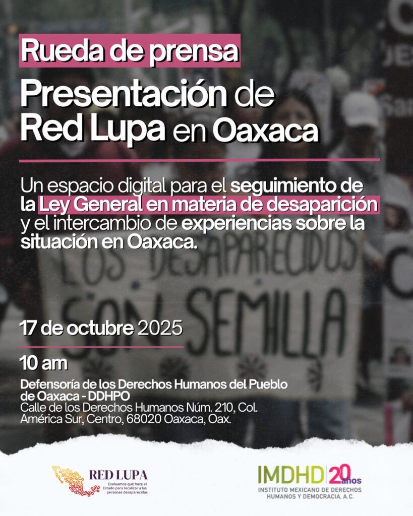 Instituto Mexicano de Derechos Humanos y Democracia (IMDHyD) invita a la presentación de la Red Lupa en Oaxaca, un espacio digital para el seguimiento de la Ley General en materia de desaparición y el intercambio de experiencias sobre la situación en el estado. Será el 17 de octubre a las 10:00 horas en la Defensoría […]