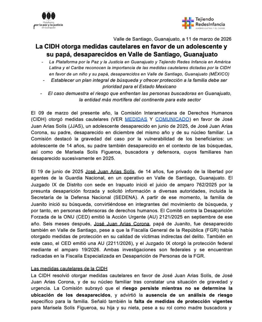 La Comisión Interamericana de Derechos Humanos otorgó medidas cautelares en favor de Juan José Arias y su papá, desaparecidos en Valle de Santiago, Guanajuato. La Plataforma por la Paz y la Justicia en Guanajuato y Tejiendo Redes Infancia en América Latina y el Caribe reconocieron la importancia de las medidas cautelares dictadas por la CIDH […]