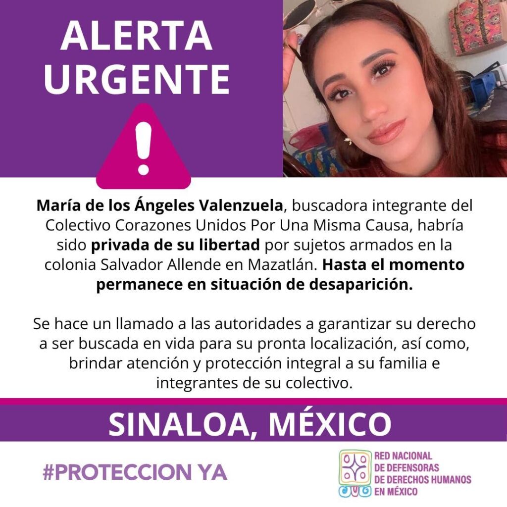 Colectivos de búsqueda, personas solidarias, la Red Nacional de Defensoras de Derechos Humanos en México e IM-Defensoras, expresaron su preocupación por la desaparición de María de los Ángeles Valenzuela, integrante del colectivo Corazones Unidos por una Misma Causa A.C. María de los Ángeles habría sido privada de su libertad por sujetos armados en la colonia […]