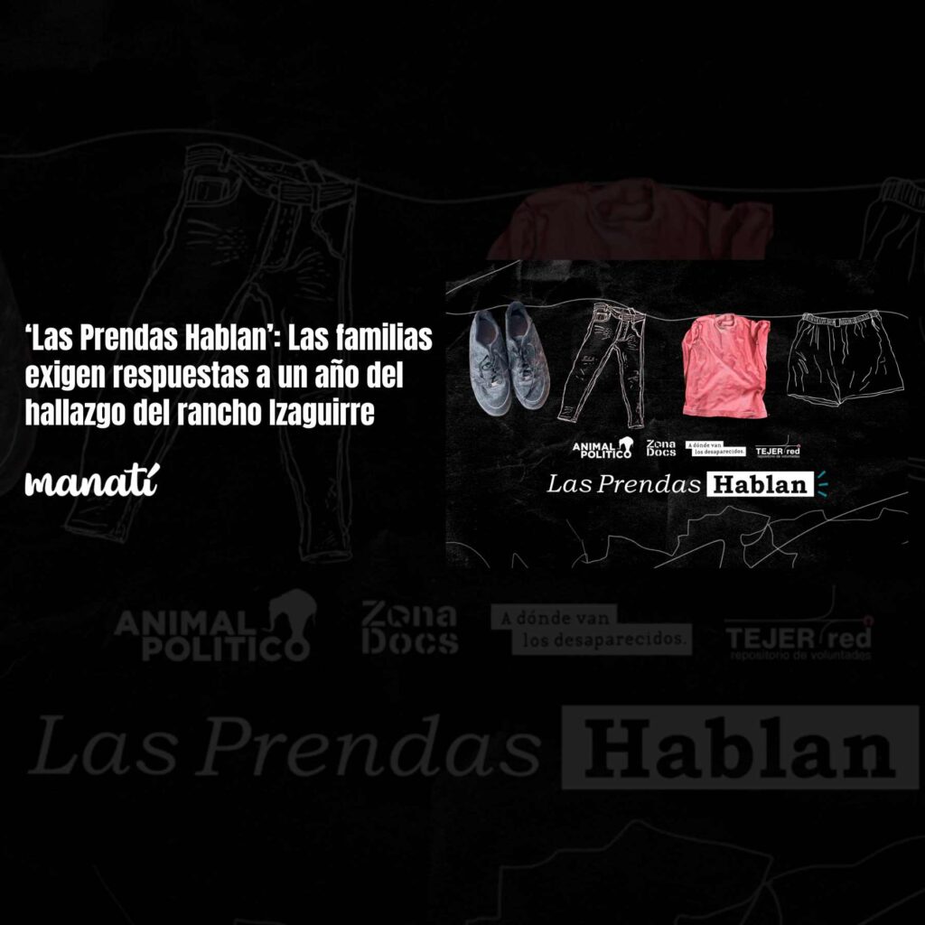 El medio digital Manatí invitó a conocer el proyecto periodístico Las Prendas Hablan. Cada pieza de ropa y objeto descubiertos el 5 de marzo de 2025 por el colectivo Guerreros Buscadores de Jalisco en el Rancho Izaguirre este centro de adiestramiento del Cártel Jalisco Nueva Generación puede ser un punto de partida para saber quién […]