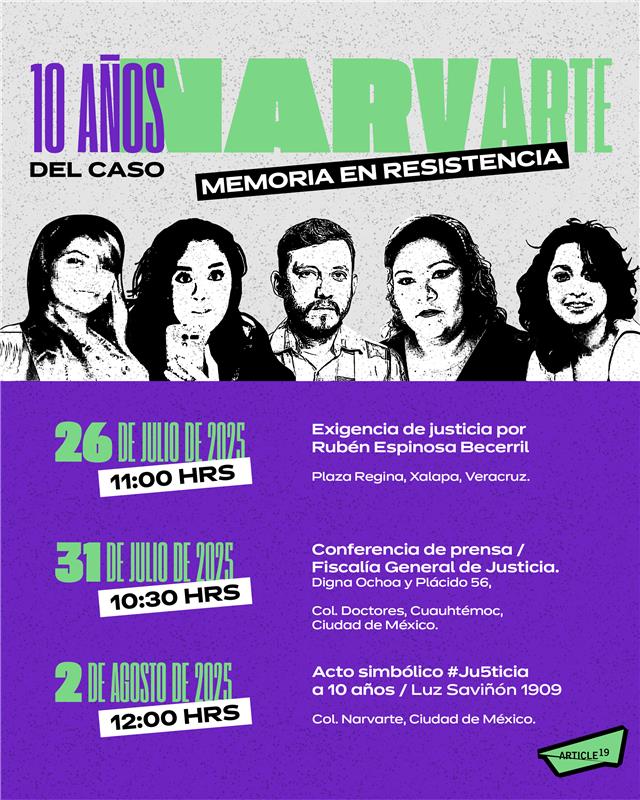 En el marco del 10 aniversario del caso Narvarte, ARTICLE 19 México y Centroamérica invita a acompañar la jornada “Memoria en resistencia “ justicia y memoria para Nadia, Mile, Rubén, Alejandra y Yesenia. El próximo 31 de julio se realizará una conferencia de prensa en la Fiscalía General de Justicia, a las 10:30 horas. En […]