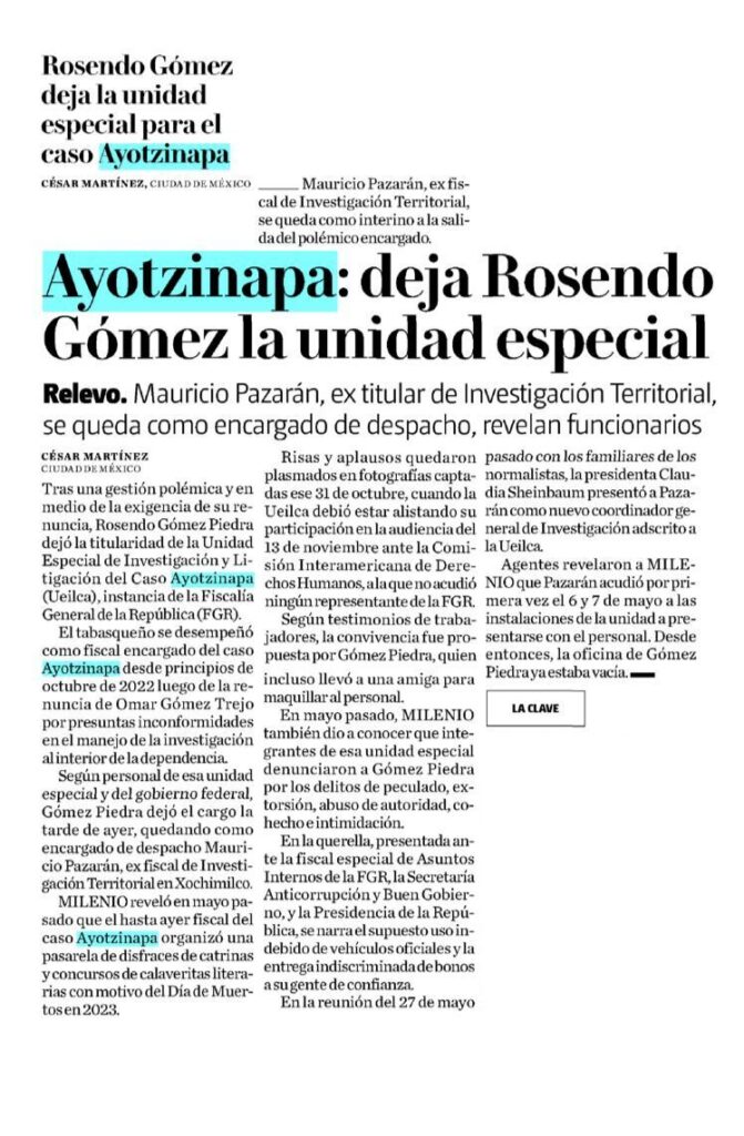 Rosendo Gómez, titular de la Unidad Especial de Investigación y Litigación para el Caso Ayotzinapa (UEILCA), renunció a su cargo, tras señalamientos por corrupción, negligencia e irregularidades administrativas. En la reunión del 27 de mayo con los familiares de los estudiantes desaparecidos, la presidenta de México presentó al nuevo Coordinador General de la UEILCA. Sin […]
