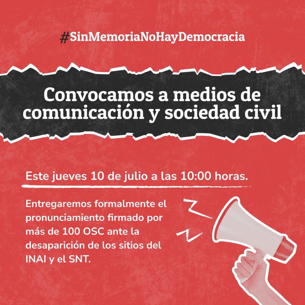 La organización civil Mexiro convoca a medios de comunicación y sociedad civil a la entrega formal del pronunciamiento firmado por más de 100 organizaciones de la sociedad civil ante la desaparición de los sitios del Instituto Nacional de Transparencia, Acceso a la Información y Protección de Datos Personales (INAI) y del Sistema Nacional de Transparencia. […]